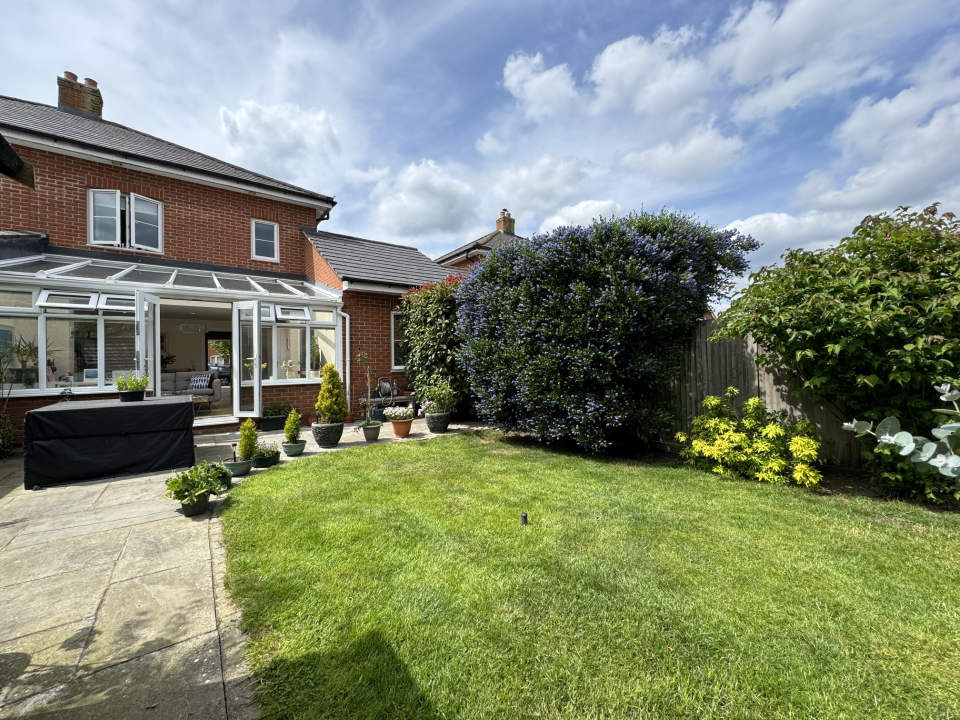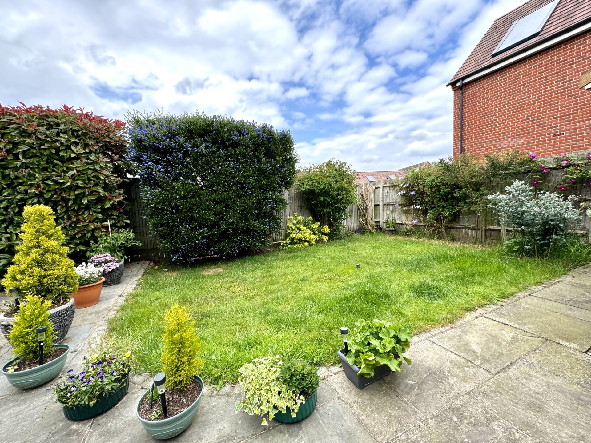 LANDSCAPED REAR GARDEN. Fully enclosed on all sides via panelled fencing with gated access leading to the front of the house, a substantial paved terrace extends from the rear of the property being ideal for 'al fresco' dining in the summer months, the remainder of the garden being laid to lawn, wooden shed.